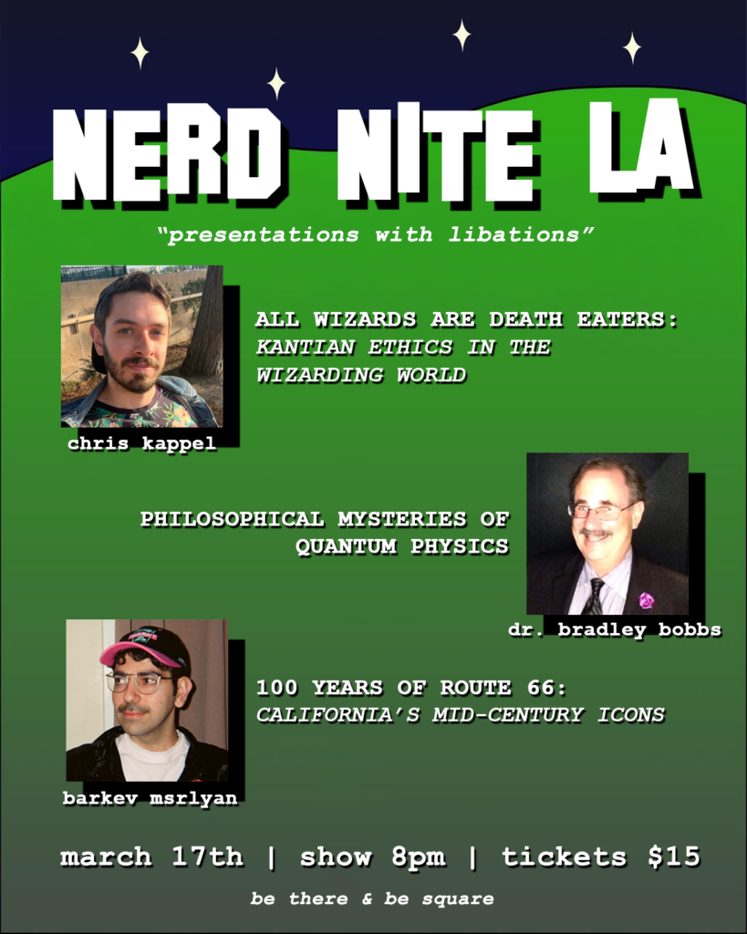Welcome to Nerd Nite Los Angeles! We’re so excited that you’ve discovered our community’s nerdy little corner of LA. We are Nerd Nite (like TED Talks or the Discovery Channel + beer), Drinking & Dragons (live, imsurovised DnD), NNXL (live music), and Nerd Nite Out (community-building). Check out what we’re up to at one of our upcoming events!